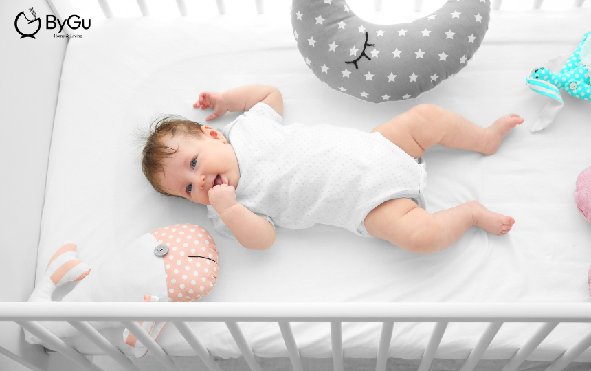 - Nệm phẳng và chắc chắn: Giường cũi phải có Nệm phẳng và cứng, vừa vặn với khung giường, không có khoảng trống lớn giữa nệm và thành cũi. Nệm phải được bọc bằng ga trải giường vừa vặn, không bị nhăn nhúm. ByGu cung cấp ga trải giường làm từ Tencel cao cấp, mềm mại, thoáng khí, an toàn cho làn da nhạy cảm của bé.