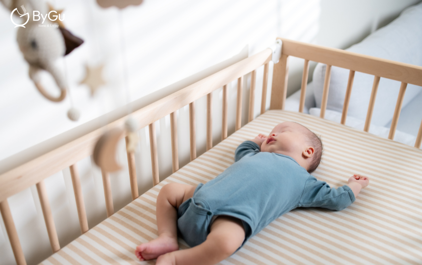- Nệm phẳng và cứng: Giường cũi của trẻ sơ sinh cần có một Nệm phẳng và cứng, vừa vặn với khung giường. Nệm cứng giúp Nâng đỡ toàn bộ cơ thể trẻ, giữ cho Cột sống thẳng hàng. Nệm phẳng ngăn ngừa tình trạng lún sâu, giảm nguy cơ ngạt thở và tạo điều kiện cho đầu trẻ di chuyển tự do. ByGu cung cấp các loại ga trải giường làm từ Tencel cao cấp, mềm mại và thoáng khí, phù hợp với nệm phẳng, cứng của trẻ sơ sinh, giúp tạo cảm giác thoải mái mà vẫn đảm bảo an toàn.